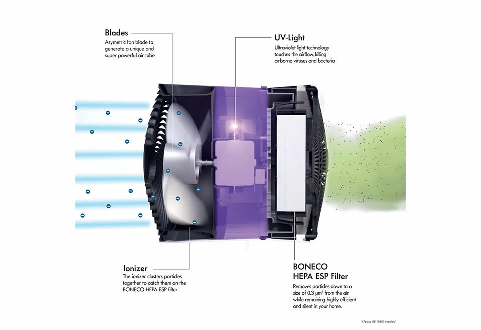 • State-of-the-art ESP air filtration with ionizer and germicidal UV-C light