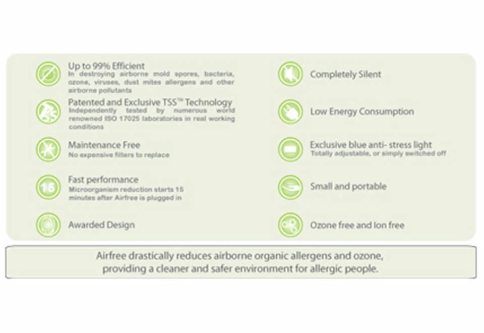• Destroys mold spores, dust mites, viruses, bacteria, pet dander and other airborne allergens