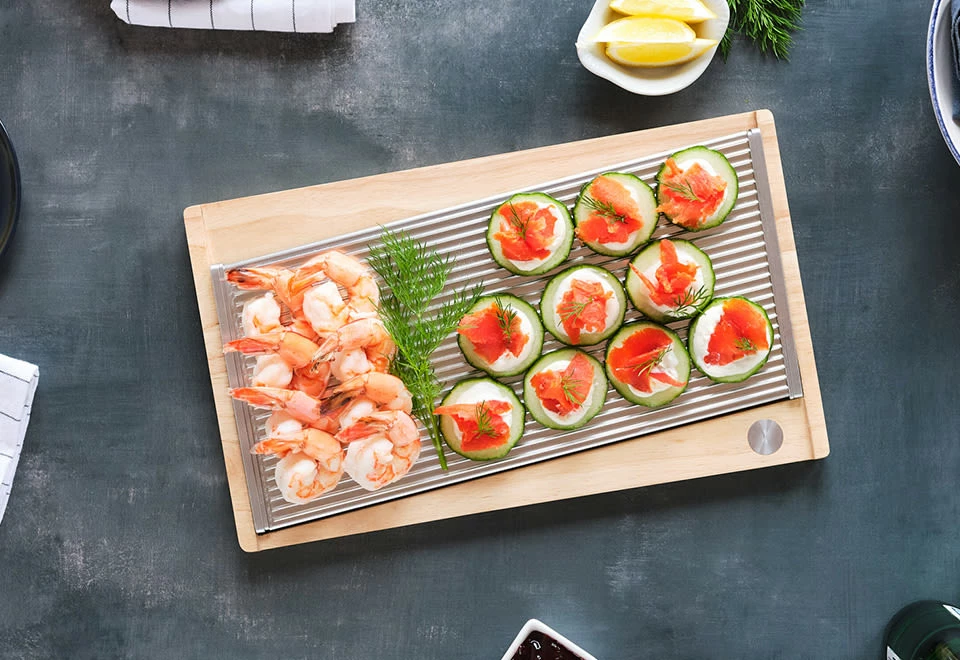 The Chilling Party Platter is the ideal way to serve snacks and hors d’oeuvres below room temperature. No batteries or electricity needed.