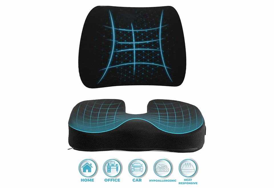 The Comfort Office Chair Cushion Set is the two-piece solution for office workers, gamers and anyone who sits for long periods of time.