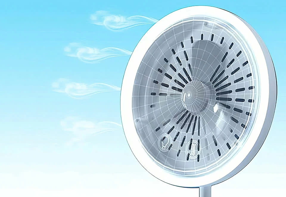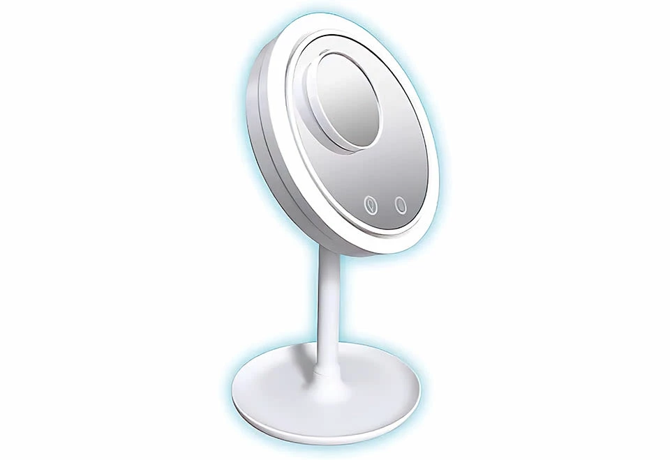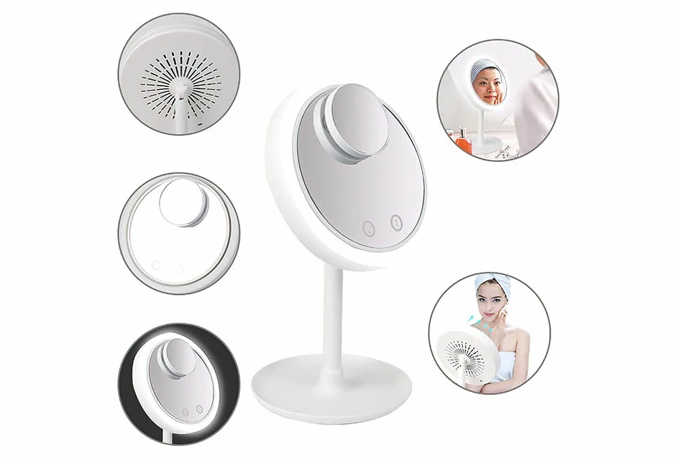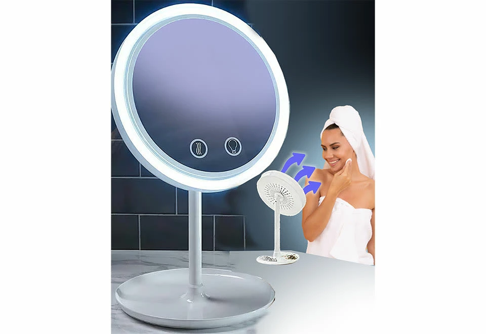 The Cool Air Vanity Mirror features LED lighting and a quiet, powerful fan to cool your skin as you apply makeup.