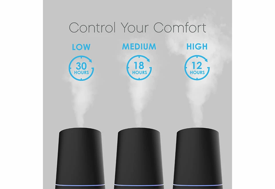 • Produces mist for approximately 12 hours (high setting) to 30 hours (low setting)