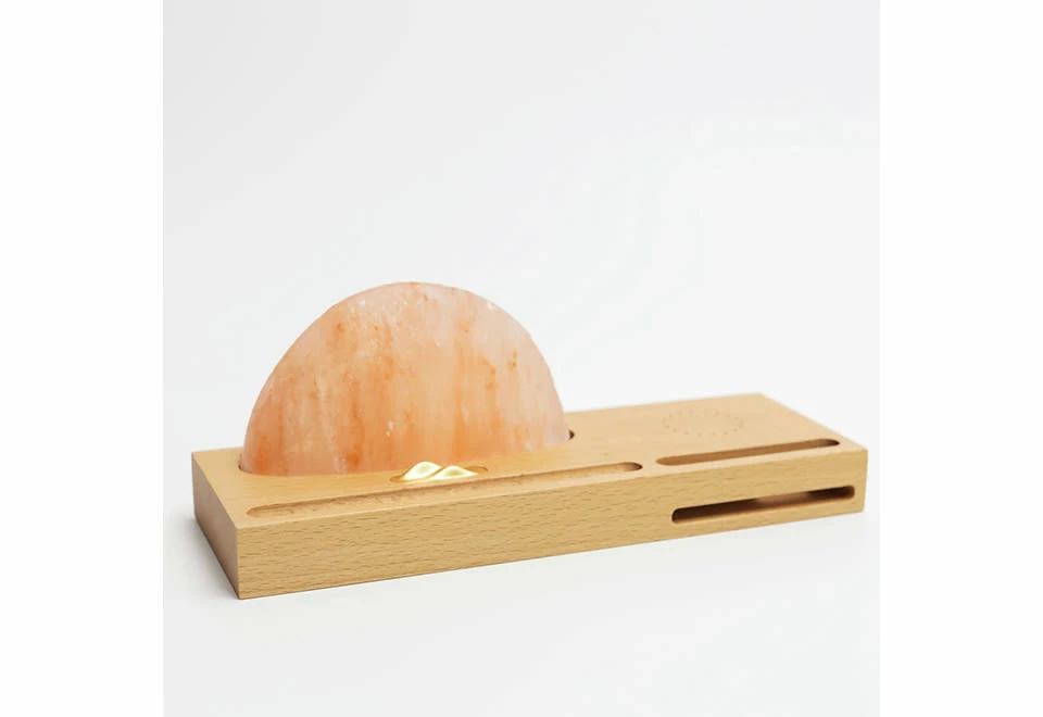 The Himalayan Salt Wireless Charger brings a warm glow to your desk or tabletop. Just plug it in and place your phone on the wooden base to begin charging.