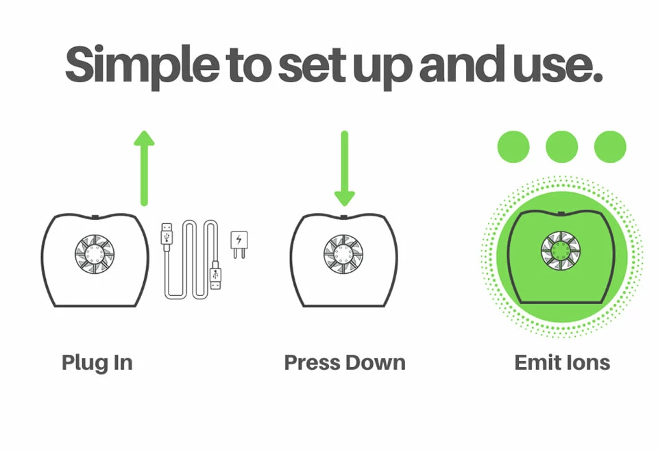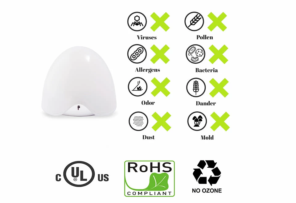 • Negative ions (oxygen atoms charged with an extra electron) bond with positively charged ions such as viruses, bacteria, VOCs, tobacco smoke, dust, pet odors, pet dander, pollen, mold spored and other allergens