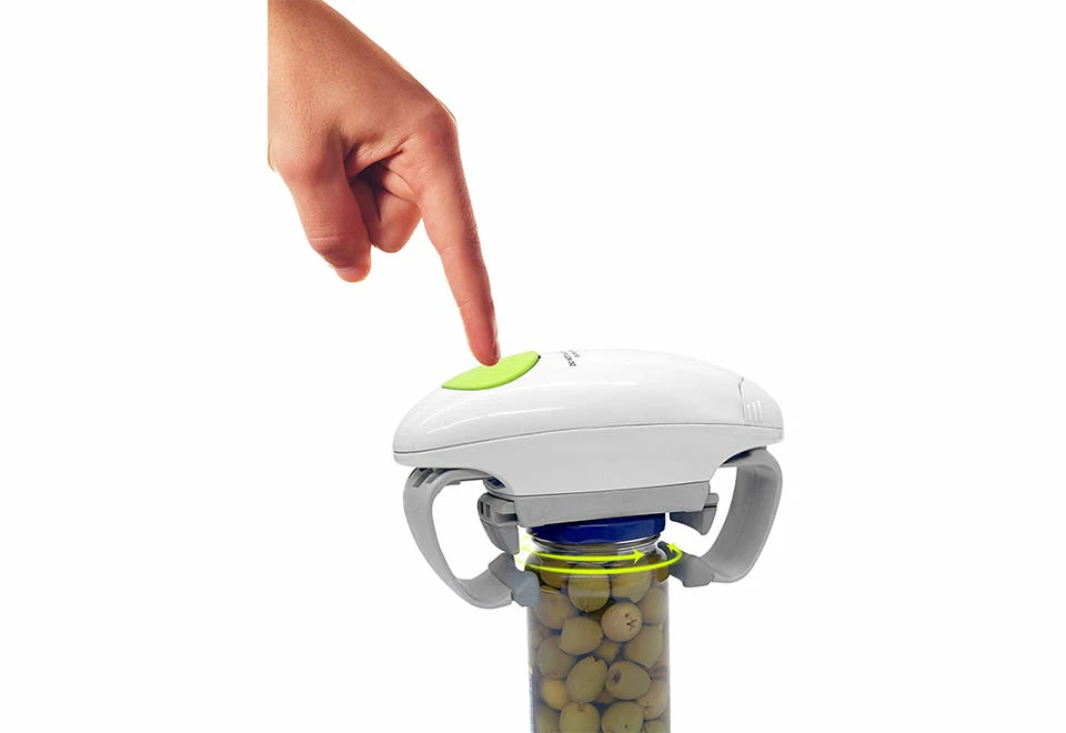 The One Touch Jar Opener automatically opens the toughest, tightest jar lids in seconds. It’s cordless and portable for use anywhere.
