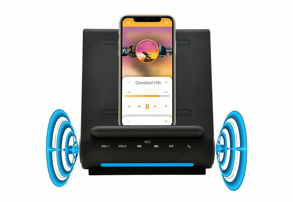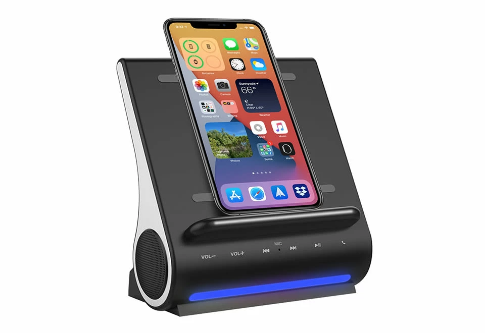 The Phone Charging Speaker Hub plays your favorite tunes while it holds and charges your smartphone.