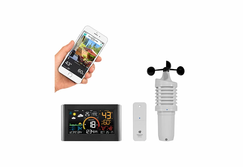 Stay ahead of Mother Nature with the Professional Weather Station. It has an outdoor sensor and a wind sensor for accurate backyard conditions and weather predictions. Use it on its own or with the free app to get even more data from the National Weather Service. Features an easy-to-read color display with time, date, indoor/outdoor temperatures and humidity, windspeed and more. App compatible with iPhone/iPad (iOS 9.0 or later) and Galaxy/Android (5.0 or later).