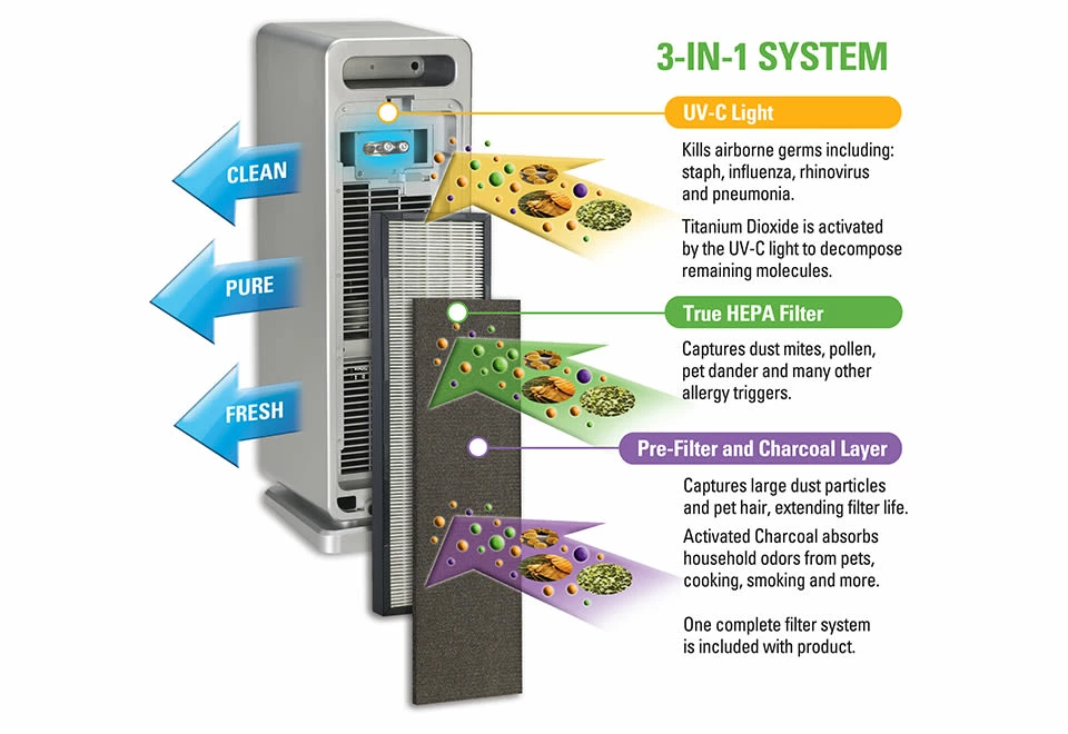 The True HEPA Air Purifier has 3-in-1 technology to clean the air in your garage, basement, or virtually anywhere in your home — a HEPA filter for particles, a UV-C light for germs and a charcoal filter for odors!