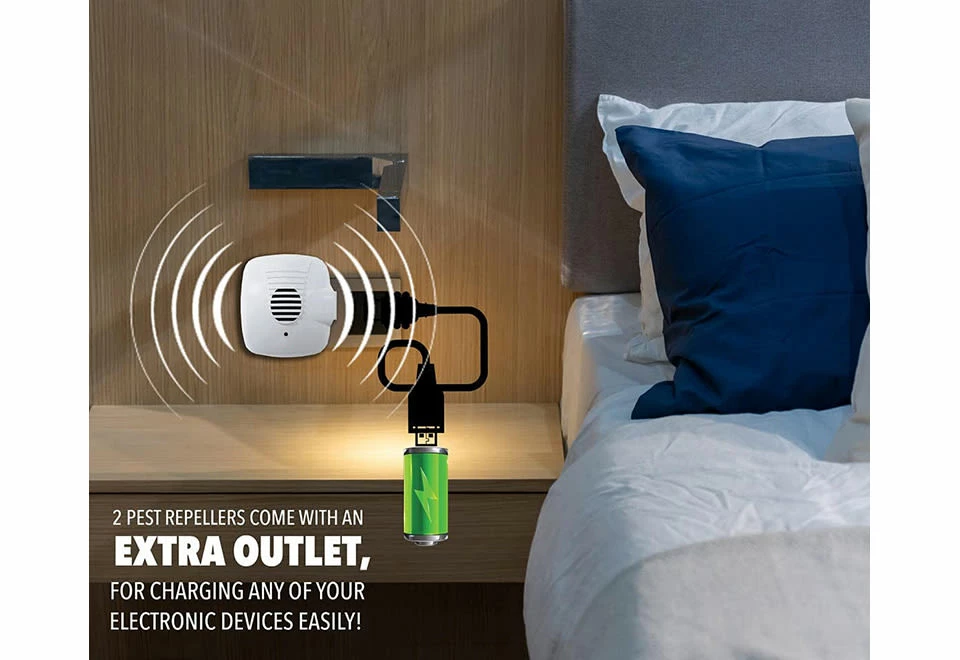 • Includes 2 large size repellers (3.25” x 3.5”) with an extra outlet built-in for charging a device