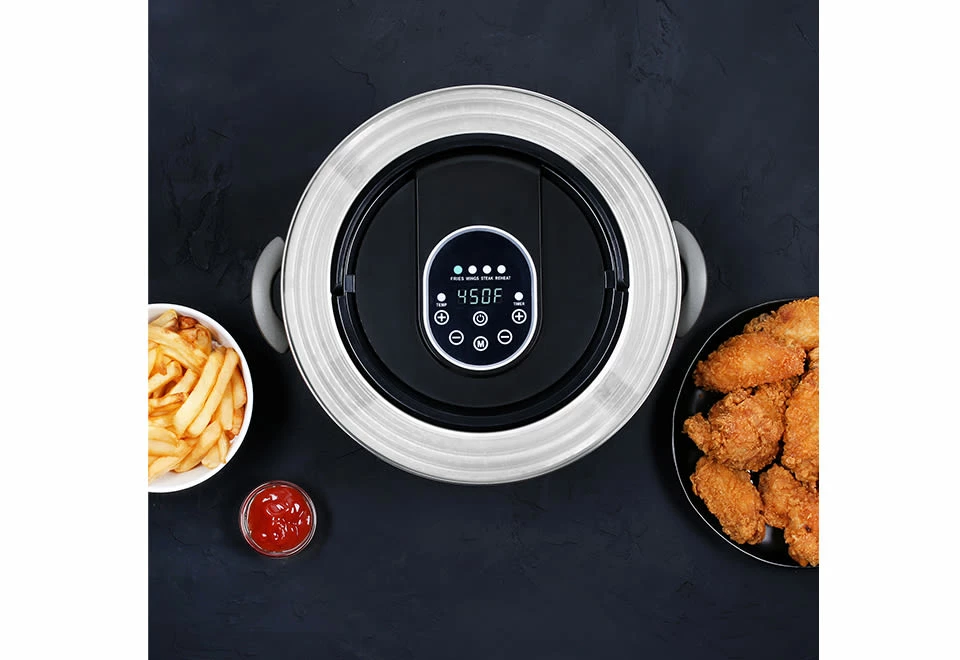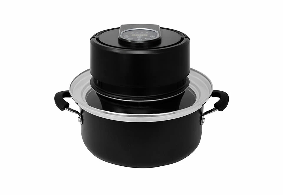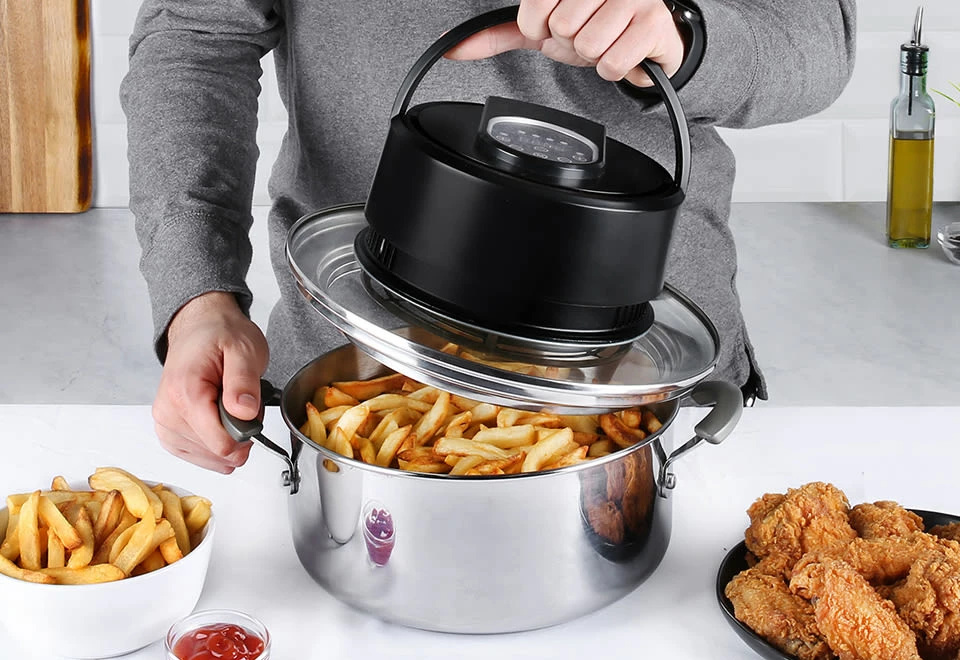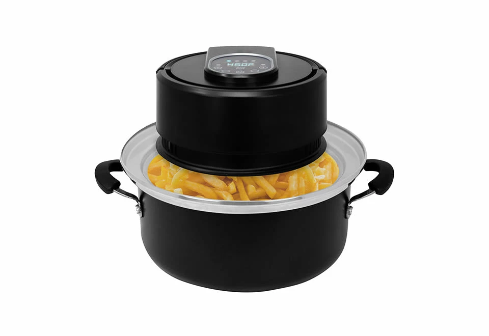 Transform your pressure cooker, pot or pan into an air fryer with the Universal Air Fryer Lid. It’s the easy way to make crispy French fries, wings and more, without a bulky air fryer.