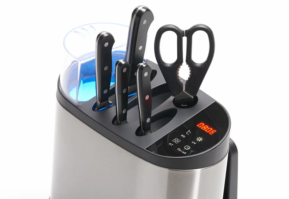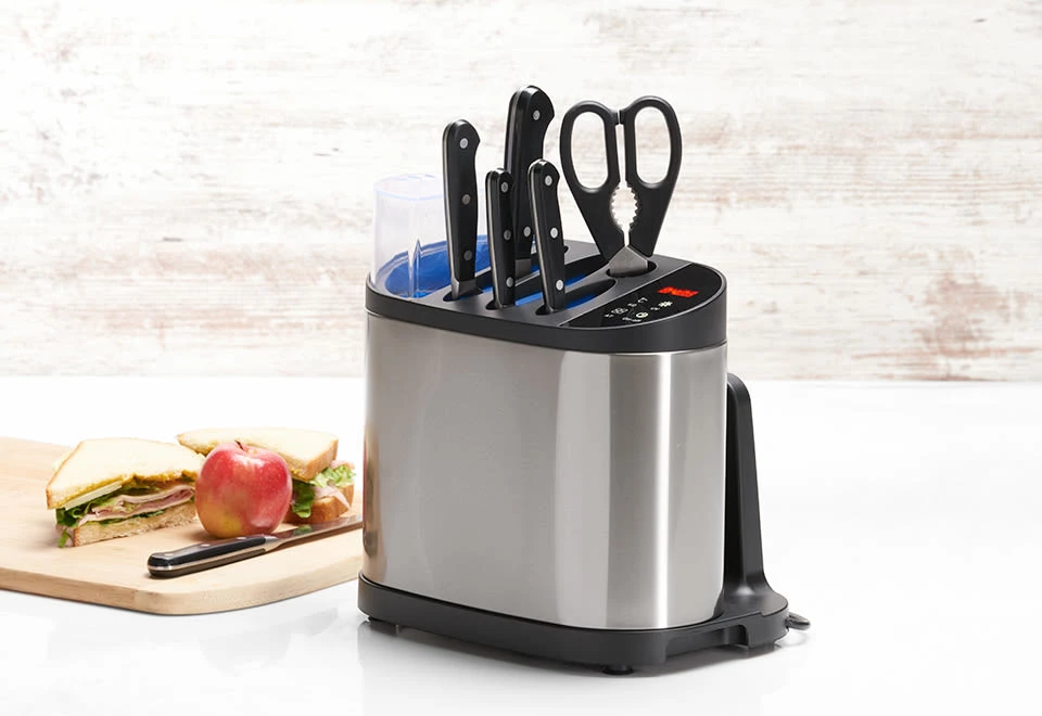 The UV Knife Sanitizer is the convenient way to reduce bacteria and other pathogens on kitchen utensils by as much as 99.9%.